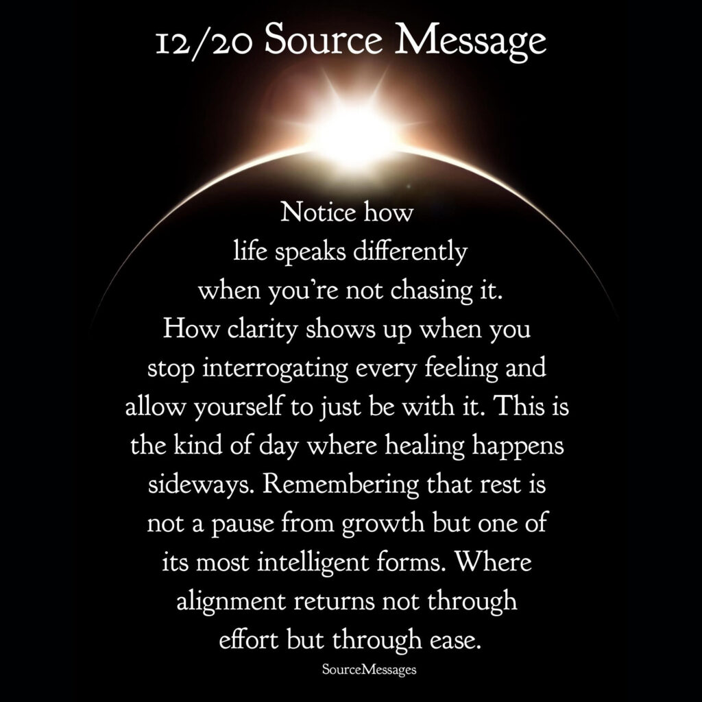 12/20/25: You may experience overlapping frequencies today, especially if you gather with friends and family. History can come to life through the parts of you that still exist in embedded memories of the past, and easily take you back to who you were then. But you are also in a very current and active process of evolving and upgrading. So you could find yourself, once again, at a bittersweet crossroads. Who you were. Who you are becoming. But this is a necessary step as you close this chapter. Your Right Action is to bless and release so that any energy still stuck can find Flow. So that you will be whole and balanced and sure-footed for your next adventure.