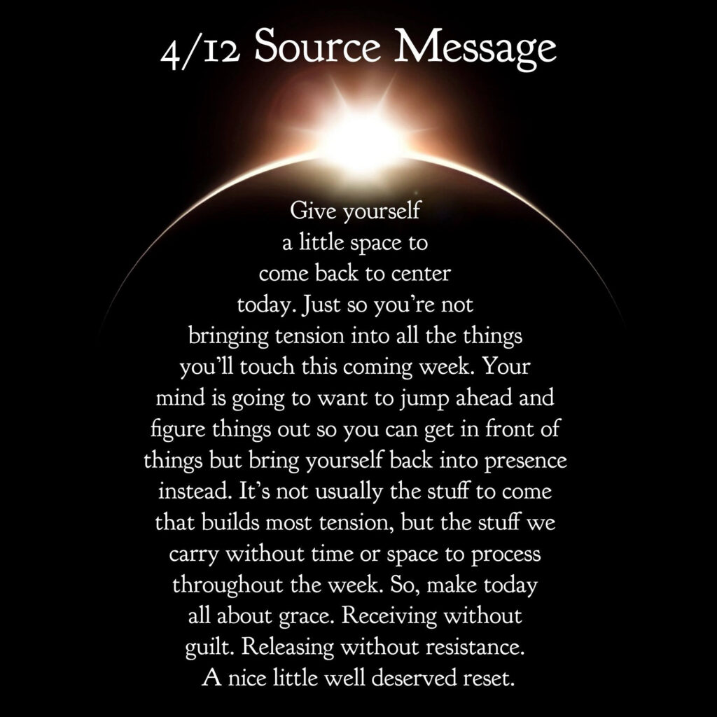4/12/26: Today offers inspiration backed by action, or at least the birth of a plan. So use today’s energy to make progress in some endeavor. You’ve got to move it, move it this month. April is offering (demanding) that you get to the party and into Flow. The wasting of this time can mean stalling out and living with what you have, where you are, for at least the next 9 years. But even if that sounds good to you, things will change around you without your input. April’s energy is aggressive in the sense that we’re all going to feel ourselves grow in real time… and watch as others do the same. This is an interactive evolutionary opportunity that you actually incarnated to facilitate. Be present with it as it blooms in living color.